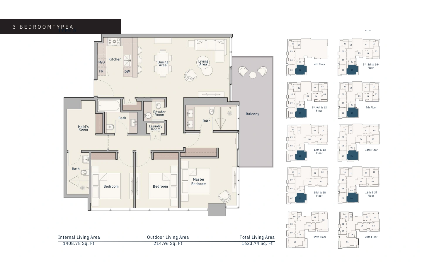 A 3 hálószobás rezidenciák visszafogott luxust kínálnak, nagyvonalú nappali–étkező terekkel, több saját fürdőszobás hálószobával és bőséges tárolókapacitással. Kifejezetten családok számára tervezték, akik értékelik a privát zónákat és a közös élettereket egy közösségközpontú, vízparti környezetben.