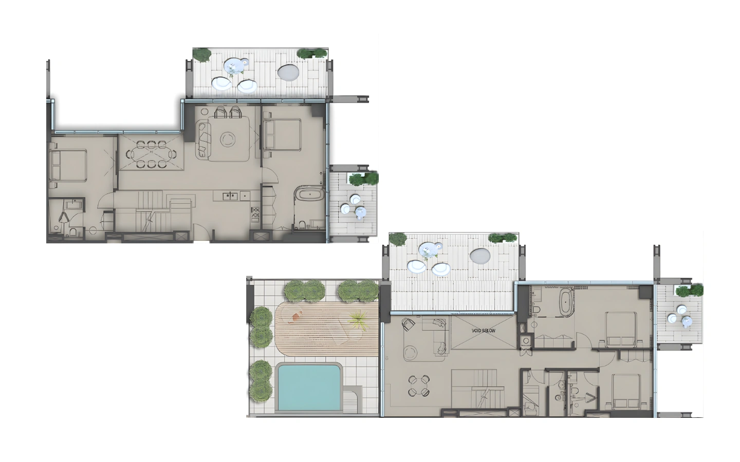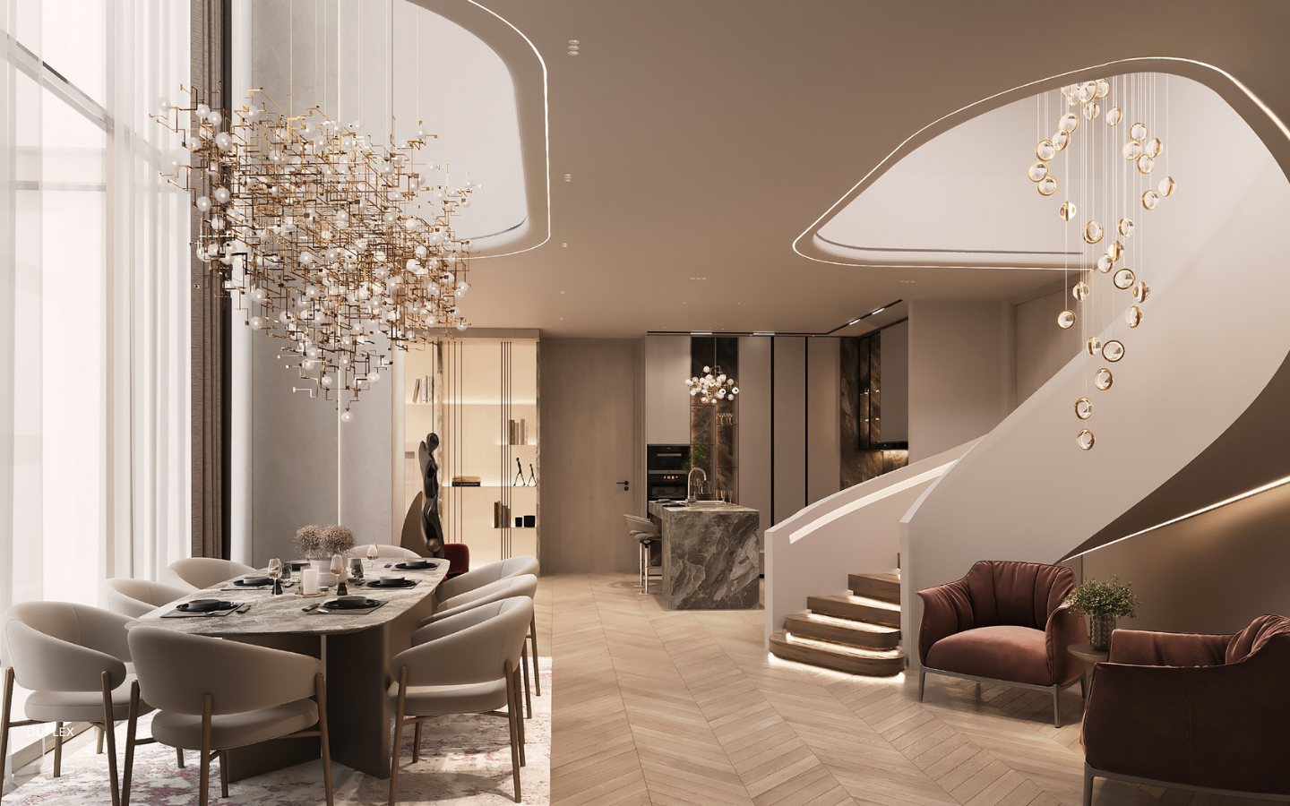 A 4 hálószobás duplex otthonok a Symphony lakáskínálatának csúcsát képviselik. Két szinten elosztva, ezek a rezidenciák grandiózus élettereket, privát hálószoba-szviteket és természetes elkülönülést kínálnak a közösségi és a személyes terek között. A nagy teraszok, a kifinomult arányok és az elegáns építészeti átmenetek „villahangulatot” teremtenek a magasban – presztízs, tér és életminőség egyetlen otthonban.