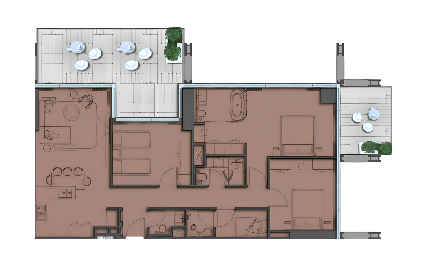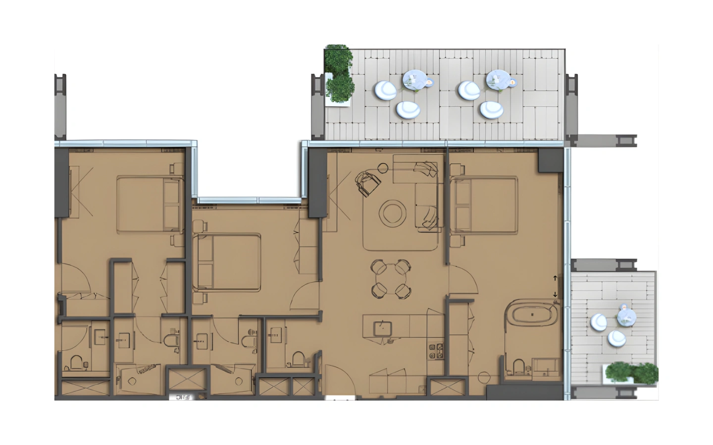 A 3 hálószobás lakásokat azoknak tervezték, akik értékelik a tágas tereket és a jól „áramló”, harmonikus elrendezést. A nappali–étkező nagyvonalúan nyílik meg, így egy elegáns, közösségi központ jön létre, miközben mindhárom hálószoba saját, jól elkülönülő privát zónát kap. A prémium anyaghasználat, a több fürdőszoba és az átgondolt közlekedési útvonalakú a mindennapokat rendezetté, nyugodttá és érezhetően magasabb színvonalúvá teszik.