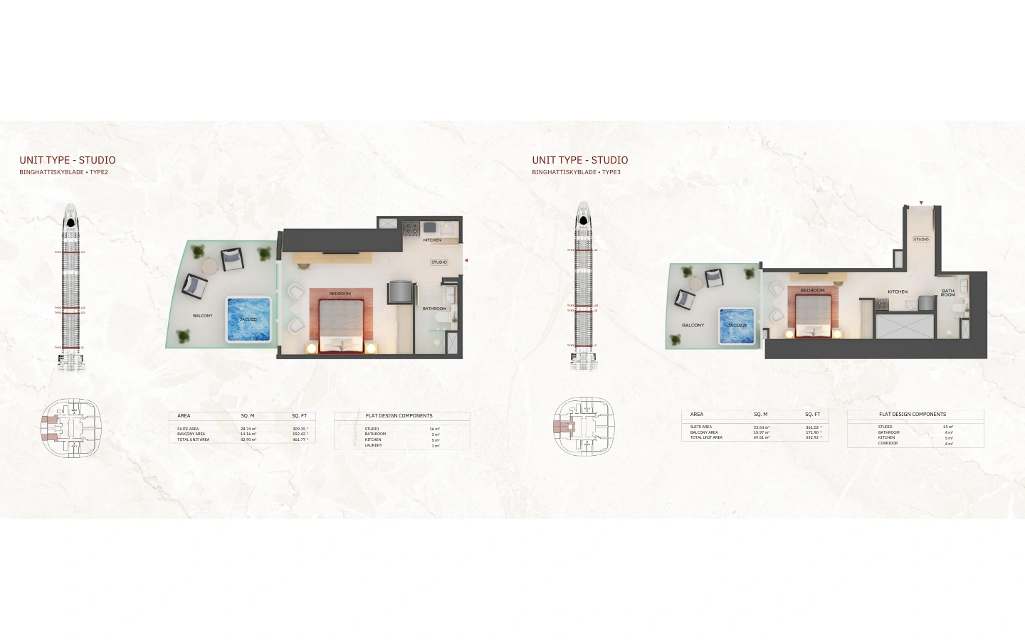 Compact yet elegant layouts designed for modern urban living. Each studio features open-plan interiors, private balconies, and floor-to-ceiling windows that maximize natural light and views of Downtown Dubai. Perfect for investors or first-time buyers.