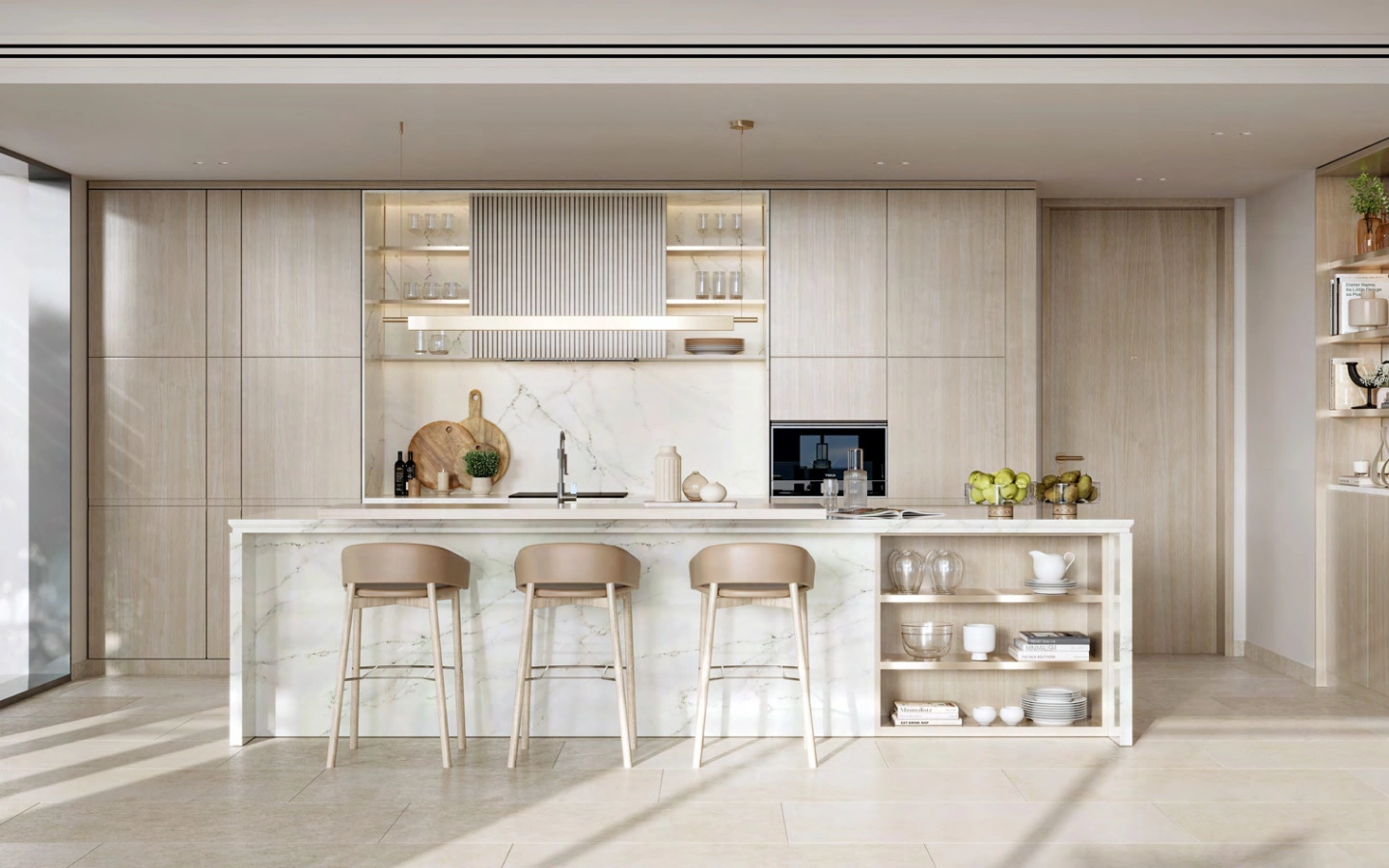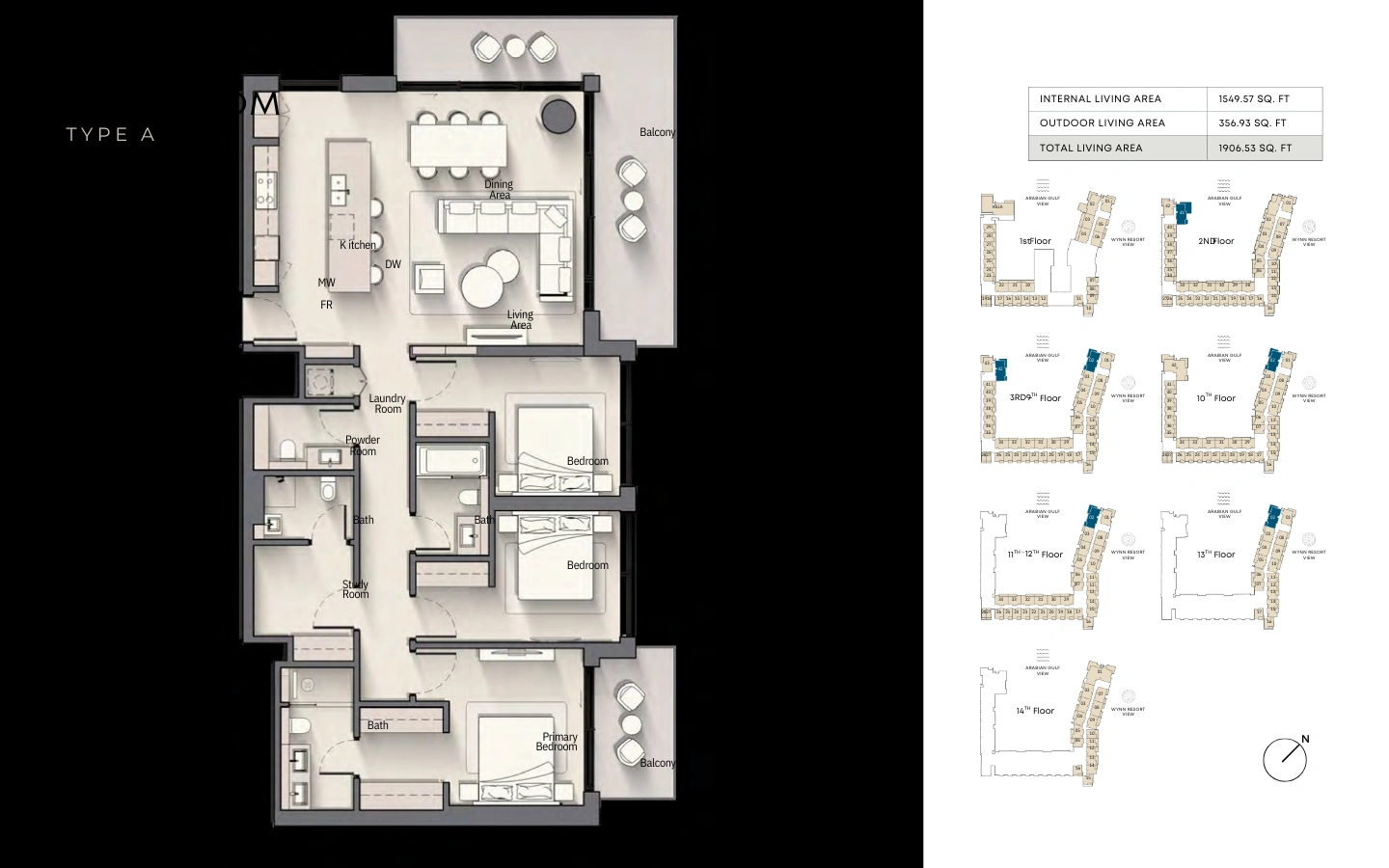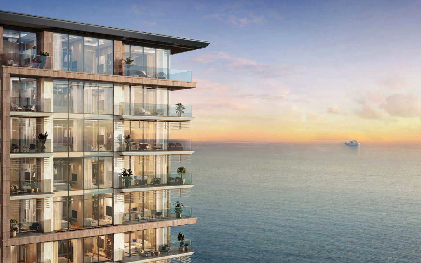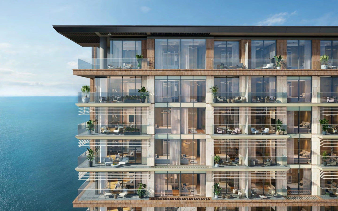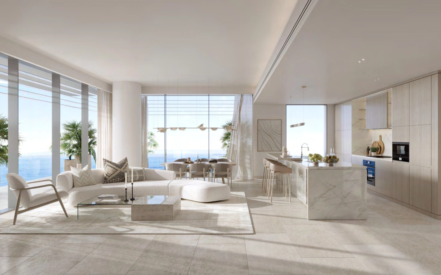 The three-bedroom residences elevate coastal living with expansive interiors, panoramic glazing, and refined material finishes. Designed to maximize light and views, these homes feature multiple balconies, elegant living and dining zones, and well-appointed bedrooms — perfect for families or discerning buyers seeking a premium island address.