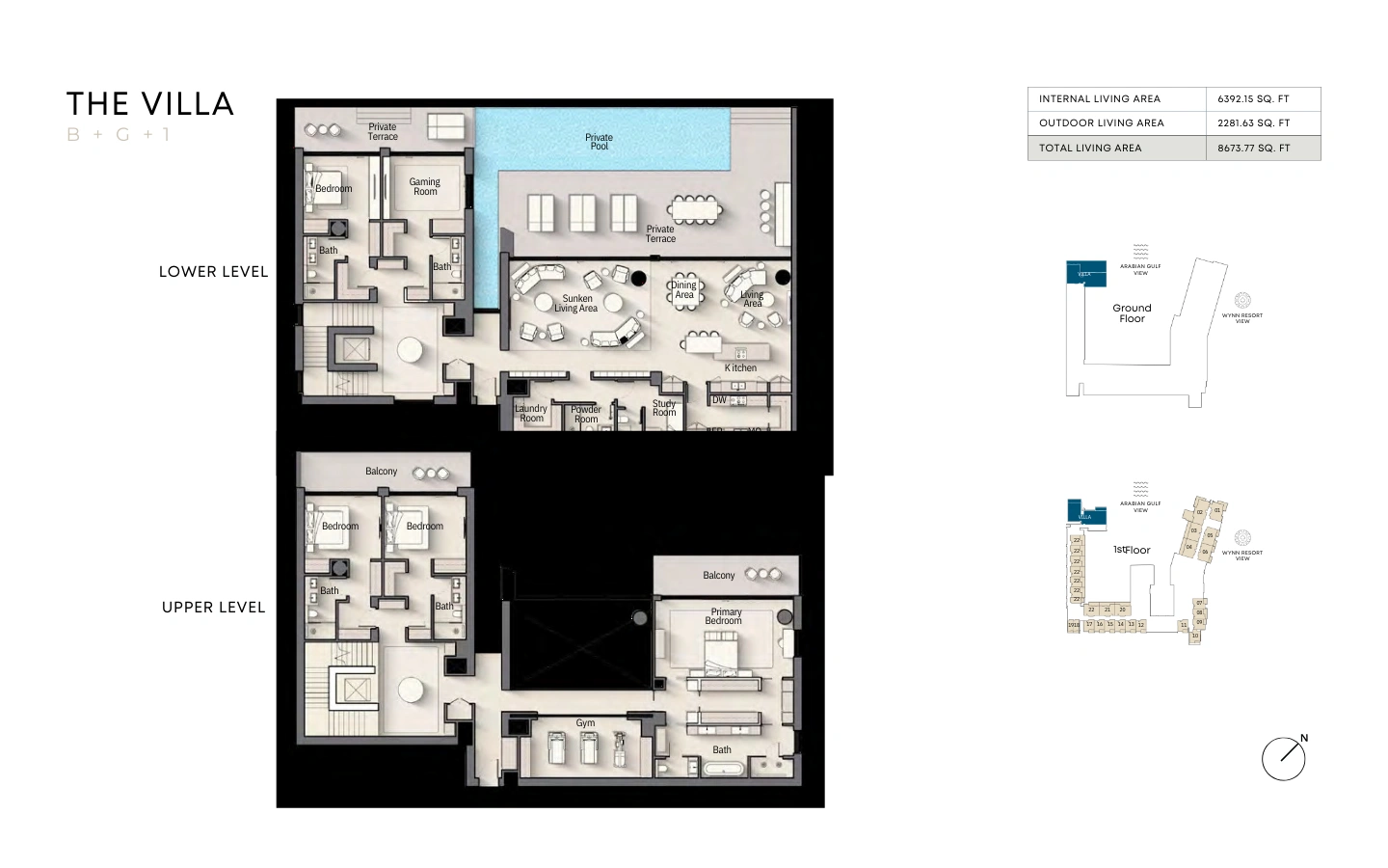 The exclusive 5-bedroom waterfront villa is a statement of refined coastal living. With private gardens, a swimming pool, multiple terraces, and expansive interior spaces, it offers the comfort and exclusivity of a private estate, set directly against the backdrop of the Arabian Gulf.